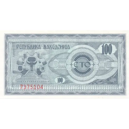 | Reverse lettering | Скопје 1992 Година Народна Банка на Македонија 100 Сто 100 (Translation: РЕПУБЛИКА МАКЕДОНИЈА 100 СТО) |