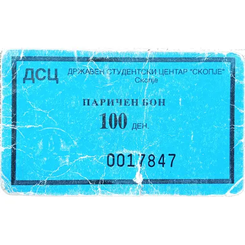 | Legenda awersu | ДCЦ ДPЖABEН CTYДEHTCКИ ЦEHTAP `CКOПJE` CКOПJE ПAPИЧEH БOH 100 ДEH. 0017847 |