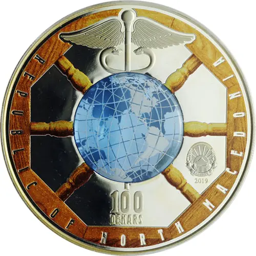 | توضیحات روی سکه | Glass inlay of the globe in foreground with ship and caduceus at centre |