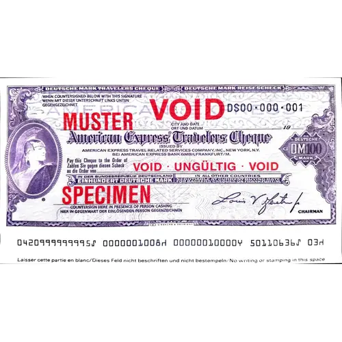 DEUTSCHE MARK TRAVELERS CHEQUE - DEUTSCHE MARK REISESCHECK American Express Travelers Cheque AMERICAN EXPRESS TRAVEL RELATED SERVICES COMPANY, INC., NEW YORK, N.Y. / BEI AMERICAN EXPRESS BANK GMBH, FRANKFURT/M. MUSTER VOID / SPECIMEN / VOID - UNGÜLTIG - VOID Louis V. Gerstner Jr. (Chairman) DS00-000-001 GIESECKE & DEVRIENT |