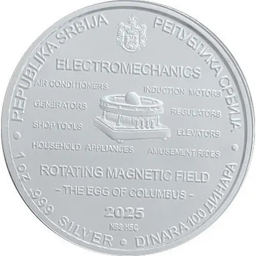 REPUBLIKA SRBIJA РЕПУБЛИКА СРБИЈА ELECTROMECHANICS AIR CONDITIONER INDUCTION MOTORS GENERATORS REGULATORS SHOP TOOLS ELEVATORS HOUSEHOLD APPLIANCES AMUSEMENT RIDES ROTATING MAGNETIC FIELD -THE EGG OF COLUMBUS- 2025 NBS-НБС 1 OZ .999 SILVER DINARA 100 ДИНАРА |