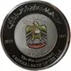 | Reverse description | The emblem of the United Arab Emirates, colorized. It consists of a golden falcon (Hawk of Quraish) with a disk in the middle, which shows the UAE flag and seven stars representing the seven Emirates of the federation. The falcon has 7 feathers also representing the 7 Emirates. The falcon holds with its talons a red parchment bearing the name of the federation in Kufic script. |