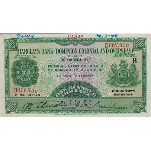 BARCLAYS BANK (DOMINION COLONIAL AND OVERSEAS) FORMERLY THE COLONIAL BANK PROMISE TO PAY THE BEARER ON DEMAND AT ITS OFFICE HERE IN LOCAL CURRENCY ONE HUNDRED DOLLARS INCORPORATED BY ROYAL CHARTER 1836 REINCORPORATED BY ACT OF PARLIAMENT 1925 BRIDGETOWN BARBADOS 1ST MARCH 1940 ACCOUNTANT MANAGER $100 HONI SOIT QUI MAL Y PENSE DIEU ET MON DROIT BRADBURY, WILLKINSON & Co. Ltd. NEW MALDEN, SURREY, ENGLAND (Translation: Shamed be the one who thinks ill of it. God and my right.) |
