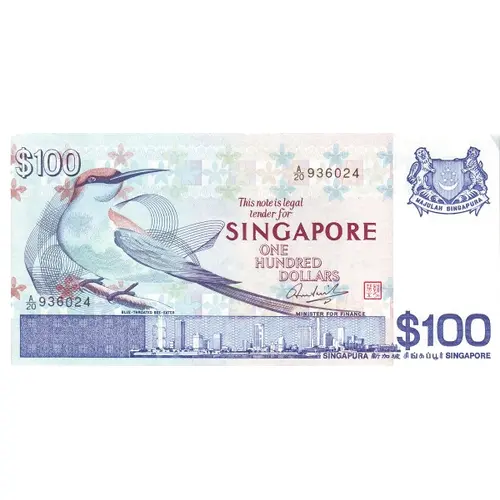 This note is legal tender for SINGAPORE ONE HUNDRED DOLLARS BLUE-THROATED BEE-EATER MINISTER FOR FINANCE SINGAPURA 新加坡 சிங்கப்பூர் SINGAPORE |