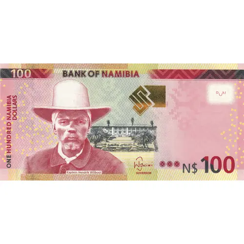 Leyenda del anverso BANK OF NAMIBIA ONE HUNDRED NAMIBIA DOLLARS Kaptein Hendrik Wotbooi