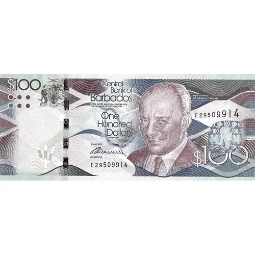 Beschrijving voorzijde Gray, brown and blue print; multicolour underprint. Black ascending-size serial numbers. Front-facing bust of Sir Grantley Adams at right; map of Barbados at centre; coat of arms of Barbados at upper left. Trident see-through feature at lower left. Windowed security thread. Dots for the blind at upper-left. Colour-changing hologram at right.
