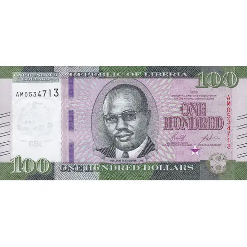 Obverse lettering One Hundred Dollars Republic of Liberia 100 2021 This Central Bank Note Is Legal Tender For One Hundred Dollars One Hundred William Richard Tolbert Jr 100 One Hundred Dollars
