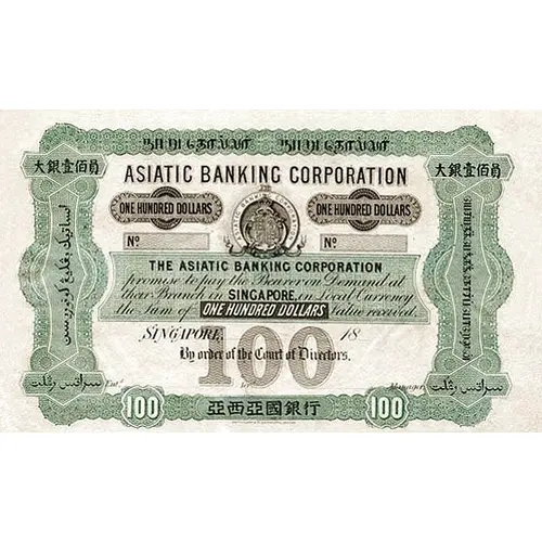 | Obverse lettering | ASIATIC BANKING CORPORATION ONE HUNDRED DOLLARS ONE HUNDRED DOLLARS THE ASIATIC BANKING CORPORATION promise to pay the bearer on demand at their branch in SINGAPORE in local currency the sum of ONE HUNDRED DOLLARS value received SINGAPORE By order of the Court of Directors |