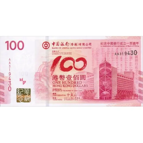 | Obverse lettering | 中國銀行(香港)有限公司 Bank of China (Hong Kong) Limited 憑票即付 Promises to pay the bearer on demand at its office here 100 港幣100圓 One hundred HKD 承董事會命 By order of the board directors 總裁 Chief executive 香港 Hong Kong 二〇一二年二月五日 5 Feb. 2012 紀念中國銀行成立100週年 In celebration of the centenary of Bank of China 華誕紀念 (Translation: Bank of China (Hong Kong) Limited Promises to pay the bearer on demand at its office here One hundred HKD By order of the board directors Chief executive 5 Feb. 2012 In celebration of the centenary of Bank of China) |