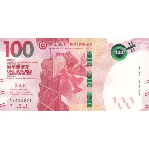 100 中國銀行(香港)有限公司 BANK OF CHINA (HONG KONG) LIMITED 憑票即付 PROMISES TO PAY THE BEARER ON DEMAND AT ITS OFFICE HERE 港幣壹佰元 ONE HUNDRED HONG KONG DOLLARS 承董事會命 BY ORDER OF THE BOARD OF DIRECTORS 總裁 CHIEF EXECUTIVE 香港 二〇一八年一月一日 HONG KONG 1 JANUARY 2018 AV 435981 100 AV 435981 |