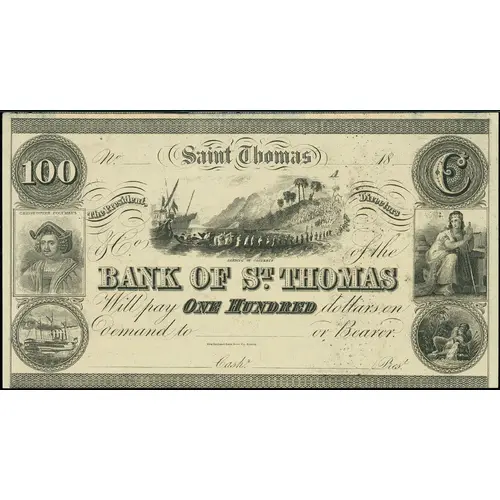 | Obverse lettering | 100 SAINT THOMAS C BANK OF ST. THOMAS Will pay ONE HUNDRED dollars on Demand to __________ or Bearer. |