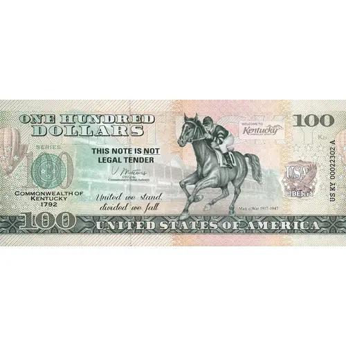 ONE HUNDRED DOLLARS SERIES COMMONWEALTH OF KENTUCKY 1792 THIS NOTE IS NOT LEGAL TENDER United we stand, divided we fall 100 Man o` War 1917–1947 100 UNITED STATES OF AMERICA |