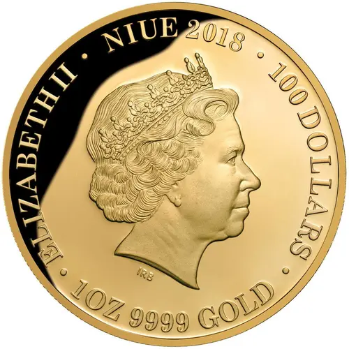 Obverse lettering · ELIZABETH II · NIUE 2018 · 100 DOLLARS · IRB 1 OZ 9999 GOLD