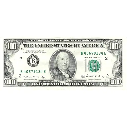 | Obverse lettering | FEDERAL RESERVE NOTE THE UNITED STATES OF AMERICA THIS NOTE IS LEGAL TENDER FOR ALL DEBTS, PUBLIC AND PRIVATE FRANKLIN ONE HUNDRED DOLLARS |