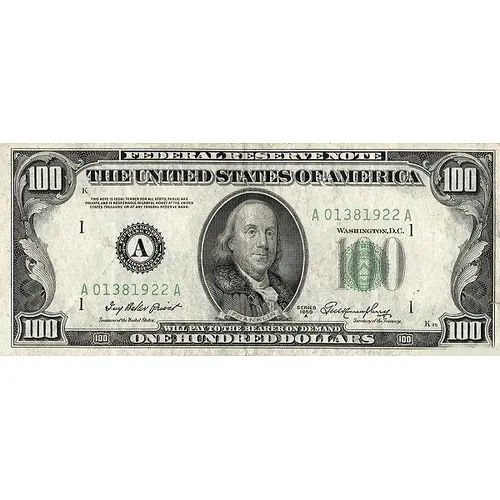FEDERAL RESERVE NOTE THE UNITED STATES OF AMERICA THIS NOTE IS LEGAL TENDER FOR ALL DEBTS, PUBLIC AND PRIVATE, AND IS REDEEMABLE IN LAWFUL MONEY AT THE UNITED STATES TREASURY, OR ANY FEDERAL RESERVE BANK WASHINGTON, D.C. WILL PAY TO THE BEARER ON DEMAND ONE HUNDRED DOLLARS |