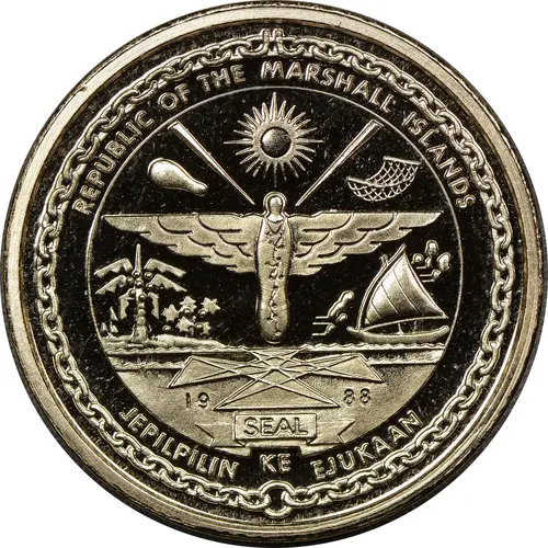 | Obverse lettering | REPUBLIC OF THE MARSHALL ISLANDS 1988 SEAL JEPILPILIN KE EJUKAAN (Translation: Accomplishment Through Joint Effort) |