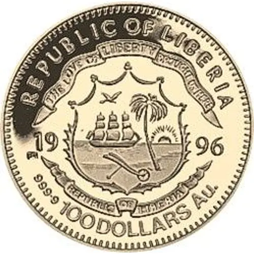 | نوشتههای روی سکه | REPUBLIC OF LIBERIA THE LOVE OF LIBERTY BROUGHT US HERE 1996 PM REPUBLIC OF LIBERIA 999·9 100 DOLLARS Au. |
