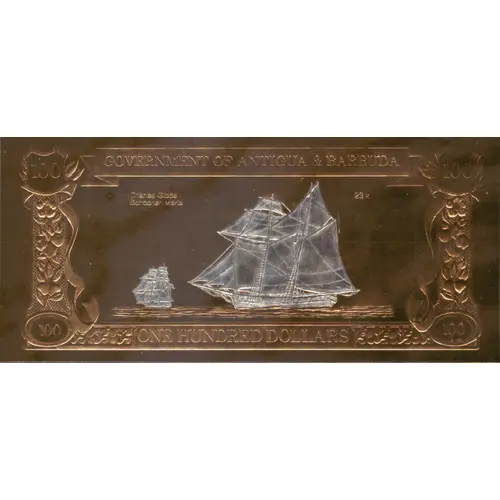 | Reverse lettering | GOVERNMENT OF ANTIGUA AND BARBUDA INDEPENDENCE NOVEMBER 1981 MINISTRY OF FINANCE ONE HUNDRED DOLLARS |