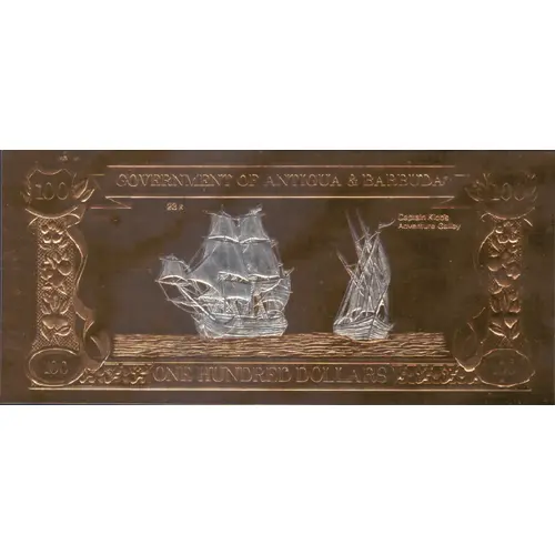 | Opschrift voorzijde | GOVERNMENT OF ANTIGUA AND BARBUDA 23K CAPTAIN KIDD`S ADVENTURE GALLEY ONE HUNDRED DOLLARS |