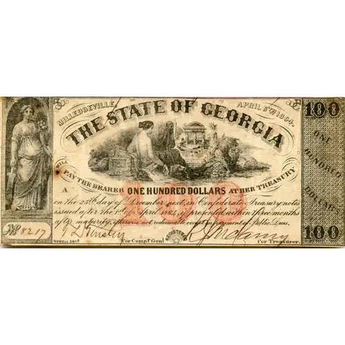 | Obverse lettering | MILLEDGEVILLE, THE STATE OF GEORGIA APRIL 6TH 1864 WILL PAY THE BEARER ONE HUNDRED DOLLARS AT HER TREASURY on the 25th day of December next, in Confederate Treasury notes issued after the 1st of April 1864, if presented within three months after maturity, otherwise not redeemable except for payment of Public Dues. |