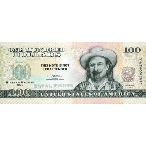 ONE HUNDRED DOLLARS SERIES STATE OF WYOMING 1890 100 THIS NOTE IS NOT LEGAL TENDER EQUAL RIGHTS 100 Buffalo Bill 1846–1917 UNITED STATES OF AMERICA |