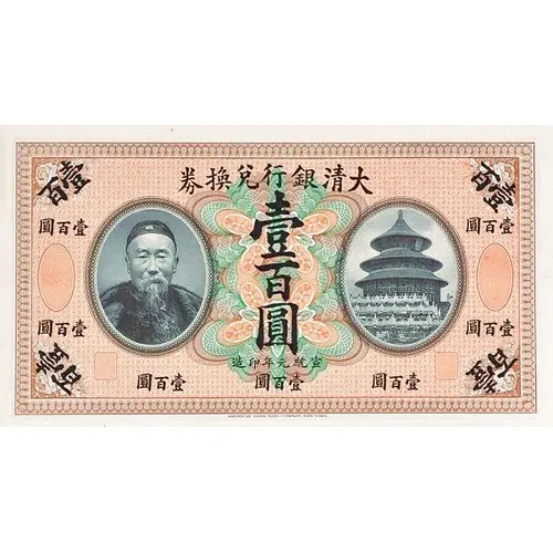 | Obverse lettering | 券換兌行銀清大 壹 百 圓 造印年元統宣 圓百壹 圓百壹 圓百壹 |