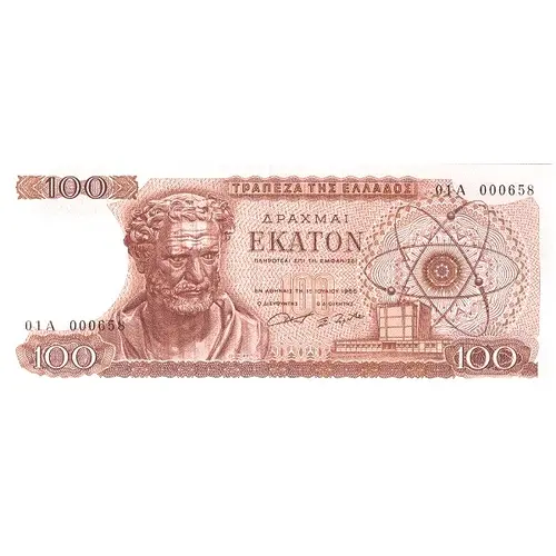 | Reverse lettering | 100 100 ΤΡΑΠΕΖΑ ΤΗΣ ΕΛΛΑΔΟΣ ΑΚΑΔΗΜΑ ΑΘΗΝΩΝ ΔΡΑΧΜΑΙ ΕΚΑΤΟΝ 100 ΙΔΡΥΜΑ ΤΡΑΠΕΖΗΣ ΤΗΣ ΕΛΛΑΔΟΣ (Translation: 100 100 Bank of Greece Academy of Athens One hundred Drachmai 100 [Printing] Works of the Bank of Greece) |