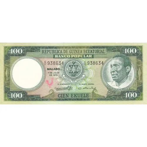 | Obverse lettering | REPUBLICA DE GUINEA ECUATORIAL BANCO POPULAR MALABO 7 DE JULIO DE 1975 CIEN EKUELE (Translation: Republic of Equatorial Guinea People`s Bank Malabo, 7th July, 1975 One Hundred Ekuele) |