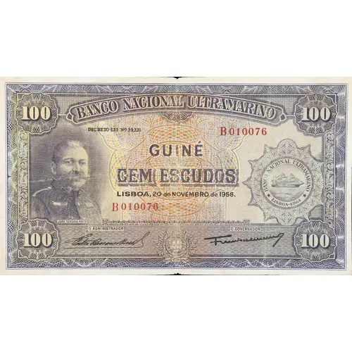 BANCO NACIONAL ULTRAMARINO DECRETOS-LEI 39.221 GUINÉ CEM ESCUDOS LISBOA, 20 de NOVEMBRO de 1958. (Translation: National Bank Overseas Decrees-Law 39,221 Guinea Hundred Escudos Lisbon, November 20, 1958) |