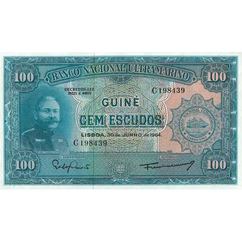| Legenda del dritto | BANCO NACIONAL ULTRAMARINO DECRETOS-LEI 39221 e 44891 GUINÉ CEM ESCUDOS LISBOA, 30 DE JUNHO DE 1964. (Translation: National Bank Overseas Decrees-Law 39221 and 44891 Guinea Hundred Escudos Lisbon, June 30, 1964) |