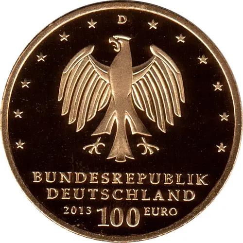| Averslegende | D BUNDESREPUBLIK DEUTSCHLAND 2013 100 Euro (Translation: D Federal Republic of Germany 2013 100 Euro) |