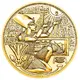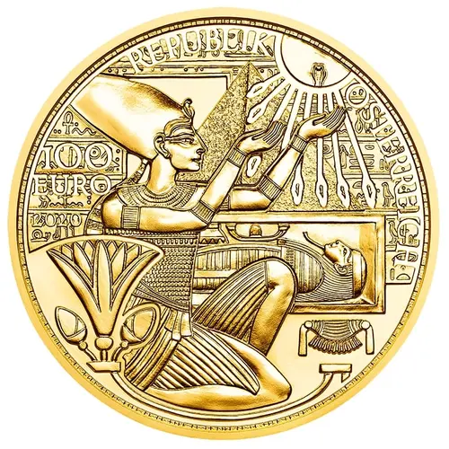 | 表面の説明 | A collage of Ancient Egyptian images, with Tutankhamun’s father Akhenaten in its centre. The elder Pharaoh is on his knees with hands raised in homage to the sun god, Aten, as the lance-shaped rays of the solar disk descend towards him. In the background we see a sarcophagus containing a Pharaoh, under which the hieroglyphic for gold can be seen. |