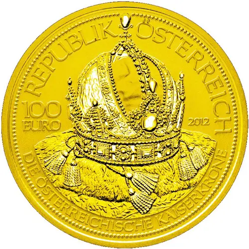 The obverse depicts the intricate details of the crown. It is made up of three parts: a circle, a high arch and a mitre. From the base or the circle are 8 lilies, an important reflection of the Crown of the Holy Roman Empire which is made of 8 panels. The high arch of the Imperial Austrian Crown also mirrors the high arch of the Holy Roman Empire Crown. The base of the Austrian Imperial crown is very intricately crafted and set with many precious stones such as zircons and pearls. The mitre consists of two halves, which are intricately engraved and decorated with fine enameled bands of birds and plants. The two halves are delicately engraved with four different scenes representing key moments in the life of Rudolf II. From the halves and in the middle of the crown the high arch rises, set with 8 diamonds and an emerald at the top to symbolize heaven. Also located on this side of the coin are the country of issue “Republik Oesterreich” (Republic of Austria), the face value of 100 euros, the year of issue 2012 and the words “Die Oesterreichische Kaiserkrone” Austrian Imperial Crown. A ring of tiny pearls along the outer edge encircles both sides of the coin. This side of the coin was designed by the Austrian Mint’s chief engraver Thomas Pesendorfer. Thomas states that he spent well over 40 hours to painstakingly carve the minute details of the elaborate crown into the plaster model. |