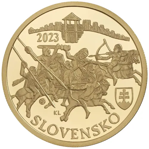 | Obverse description | The obverse depicts a medieval cavalry battle, above which is a wooden palisade with a central watchtower. The year of issuance ‘2023’ appears on the upper left side, between the battle scene and palisade. The Slovak coat of arms is positioned in the lower right of the design, and the name of the issuing country ‘SLOVENSKO’ is inscribed along the bottom edge. To the lower left of the main image are the mint mark of the Kremnica Mint (Mincovňa Kremnica), consisting of the letters ‘MK’ placed between two dies, and the stylised letters ‘KL’, referring to the coin’s designer Karol Ličko. |