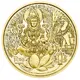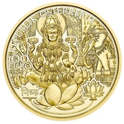 The obverse of the coin features Lakshmi sitting in a lotus flower, flanked by elephants. Two of her four hands hold lotus blossoms while the other two offer us gold coins. Below her is the inscription Nishka, a Sanskrit word meaning ‘small golden disc for monetary purposes’. |