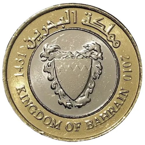 | Obverse description | The Coat of Arms of Kingdom of Bahrain and the Country`s Name in Arabic and English along with the Hijri (Islamic) and Gregorian dates in English. |
