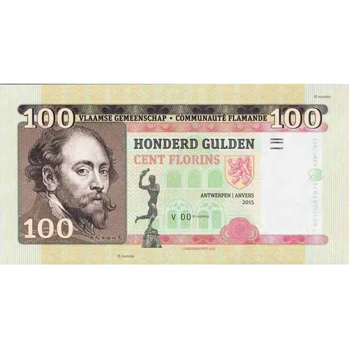 100 VLAAMSE GEMEENSCHAP COMMUNAUTÉ FLAMANDE 100 HONDERD GULDEN CENT FLORINS ANTWERPEN ANVERS 2015 100 PA RVBENS. FE SPECIMEN ECHANTILLON GABRISBANKNOTE 2015 |