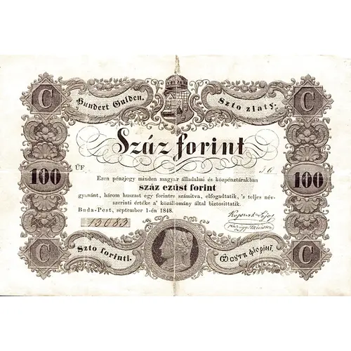 | Obverse lettering | 100 SZÁZ FORINT Ezen pénzjegy minden álladalmi és közpénztárakban száz ezüst forint gyanánt, három húszast egy forontra számítva, elfogadtatik, `s teljes név- szerinti értéke a közállomány által biztosíttatik. Buda-Pest, september 1-én, 1848 Kossuth Lajos Pénzügyminszter (Translation: 100 forint This state-note, in all national and public financial institutions, as 100 silver forint - counting three 20 krajczár coins for one forint - shall be in its full face value and shall be redeemed from the central funds Budapest, September the 1st, 1848 Lajos Kossuth minister of finance) |