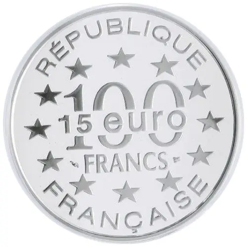 | Obverse lettering | RÉPUBLIQUE 100 FRANCS 15 euro FRANÇAISE (Translation: Republic 100 Francs 15 Euro of France) |