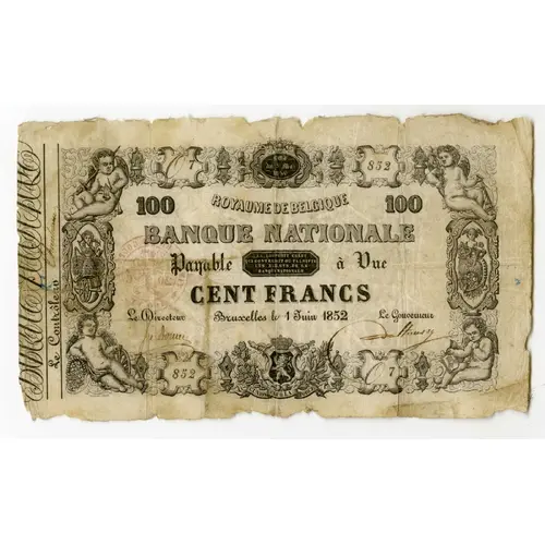 LOI DU 5 MAI 1850 100 ROYALME DE BELGIQUE 100 BANQUE NATIONALE Payable à Vue LA LOI PUNIT CELUI QUI CONTREFAIT OU FALSIFIE LES BILETES DE LA BANQUE NATIONALE CENT FRANCS Bruxelles, le 1 Juin 1852 (Translation: Law of May 5, 1850 Kingdom of Belgium National Bank Payable on sight The law punishes the one who counterfeits or falsifies the notes of the National Bank One Hundred Francs Brussels, June 1st., 1852) |