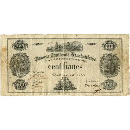 | Opschrift voorzijde | FRANCS 100 Banque Cantonale Neuchâteloise IL SERA PAYÉ EN ESPÈCES, A VUE, AU PORTEUR, cent francs. Le Controleur, Neuchâtel, le 30 avril 1856 Le Caissier, Le Directeur, BANQUE CANTONALE NEUCHATELOISE 100 FRANCS A. BOVET A Genève |