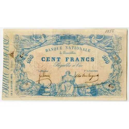 LA LOI PUNIT LE CONTREFACTEUR BANQUE NATIONALE à Bruxelles CENT FRANCS Payable à Vue LE 2 JANVIER 1856. (Translation: The law punishes the counterfeiter National Bank In Brussels One Hundred Francs Payable on sight January 2nd., 1856.) |
