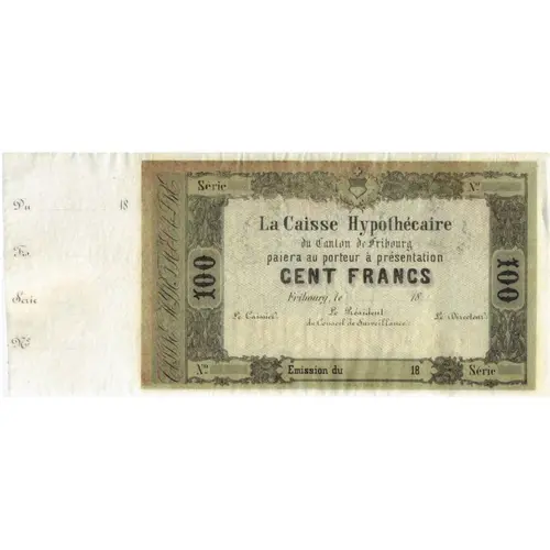 | Legenda del dritto | La Caisse Hypothéquaire du Canton de Fribourg paiera au porteur à présentation DIX FRANCS 100 100 Fribourg, le 18 Le Caissier : Le Président du Conseil de Surveillance : Le Directeur : Emission du 18 |