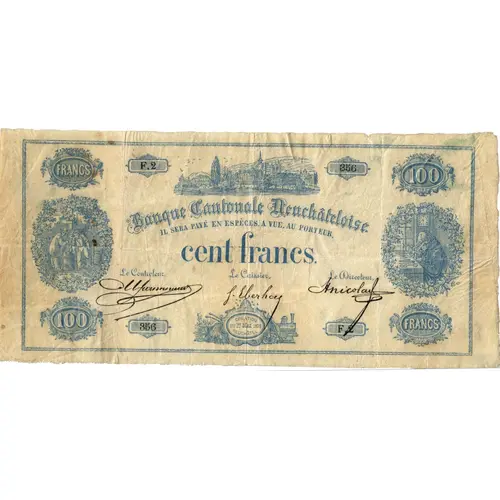 | Obverse lettering | FRANCS 100 Banque Cantonale Neuchâteloise IL SERA PAYÉ EN ESPÈCES, A VUE, AU PORTEUR, cent francs. Le Controleur, Le Caissier, Le Directeur, 100 CRÉATION DU 1er MAI 1878 NEUCHÂTEL FRANCS |