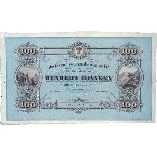 Obverse lettering 100 100 Die Ersparniss-Cassa des Kantons Uri zahlt dem Ueberbringer HUNDERT FRANKEN Altdorf, den 1. März 1878. Der Präsident: Der Verwalter: Der Buchhalter: EMISSION LIT. A. 100 100