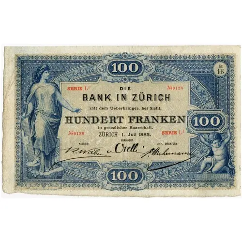 100 DIE BANK IN ZÜRICH zahlt dem Uberbringer, bei Sicht, HUNDERT FRANKEN 100 In gesetzlicher Barschaft ZÜRICH 1. Juli 1883. DER PRÄSIDENT: DER KASSIER: DER DIREKTOR: 100 |