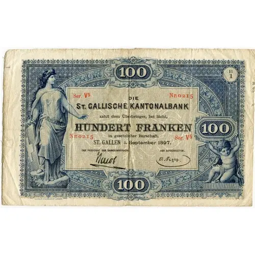 Leyenda del anverso 100 DIE ST. GALLISCHE KANTONALBANK zahlt dem Uberbringer, bei Sicht, HUNDERT FRANKEN 100 In gesetzlicher Barschaft ST. GALLEN 1. September 1897. DER PRÄSIDENT DER BANKCOMMISSION: DER BANKDIREKTOR: 100