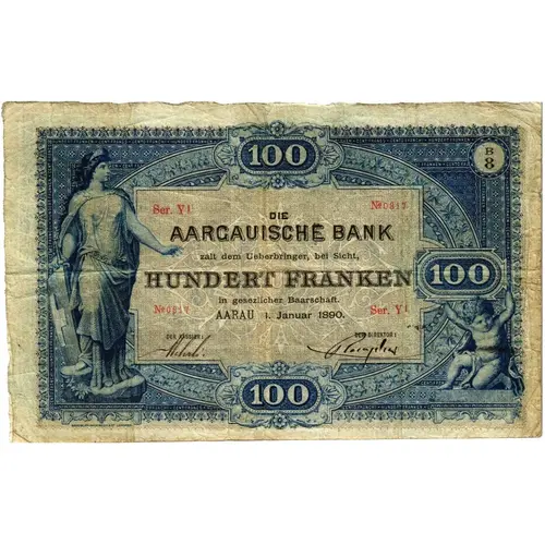 100 DIE AARGAUISCHE BANK zahlt dem Uberbringer, bei Sicht, HUNDERT FRANKEN 100 In gesetzlicher Barschaft. AARAU 1. Januar 1890. DER KASSIER : DER DIREKTOR : 100 |