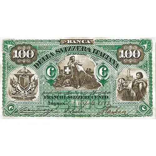 | Obverse lettering | 100 LA BANCA 100 DELLA SVIZZERA ITALIANA IN LUGANO CINQUANTA CINQUANTA FRANCHI SVIZZERI CENTO Lugano, il 1 Aprile 1883 IL CASSIERE IL PRESIDENTE IL DIRETTORE American Bank Note Co New York |