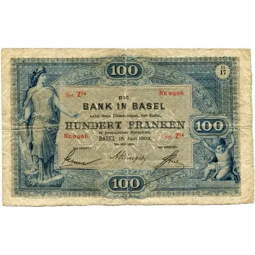 | Obverse lettering | 100 DIE BANK IN BASEL zahlt dem Überbringer, bei Sicht, HUNDERT FRANKEN 100 in gesetzlicher Barschaft. BASEL 15 Juni 1902. DER PRÄSIDENT : DER KASSIER : DER DIREKTOR : 100 |